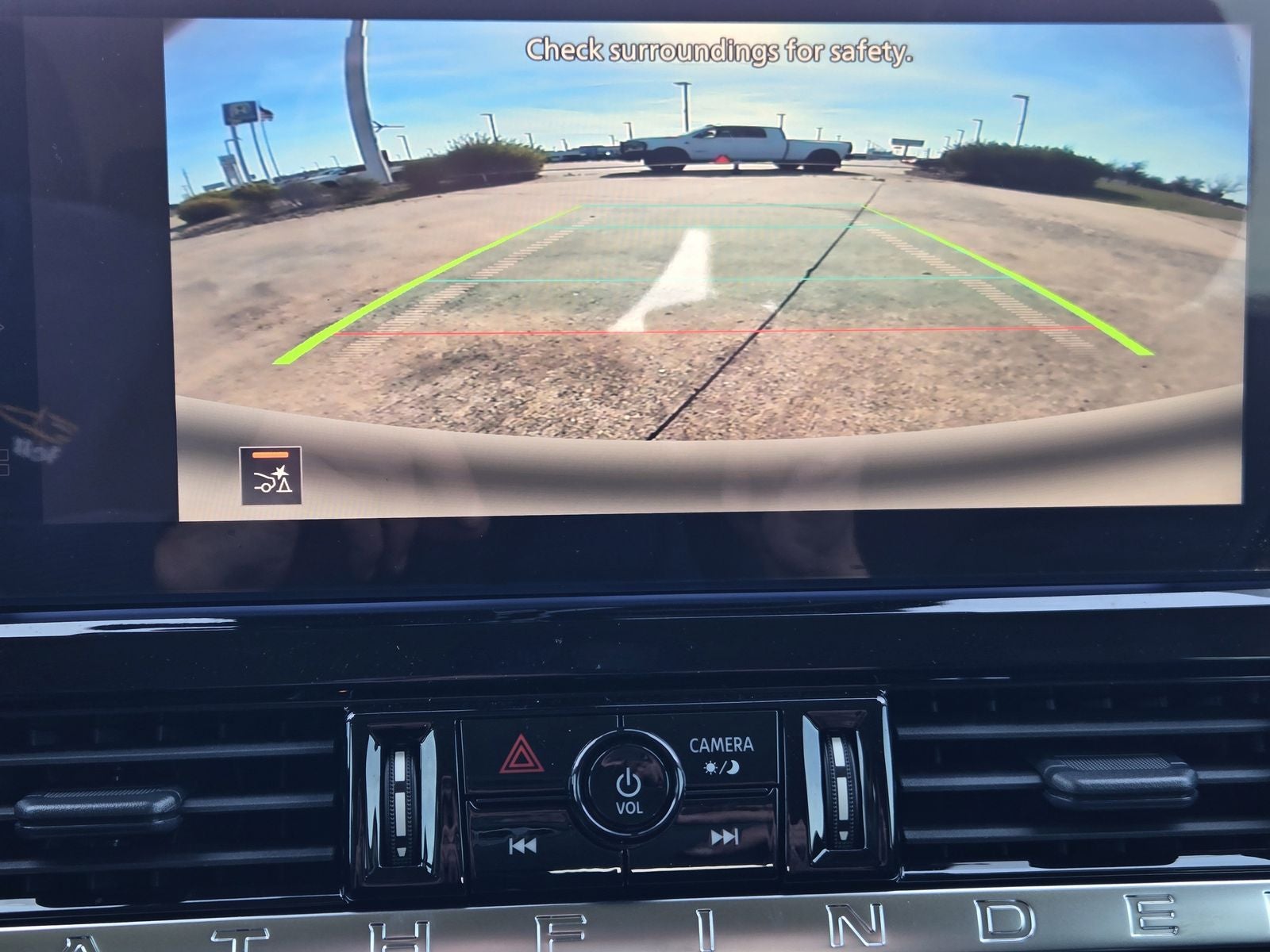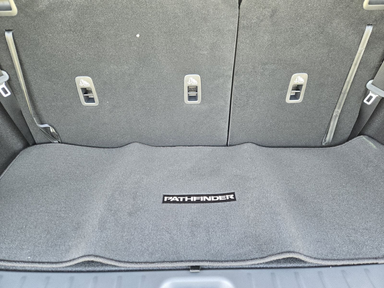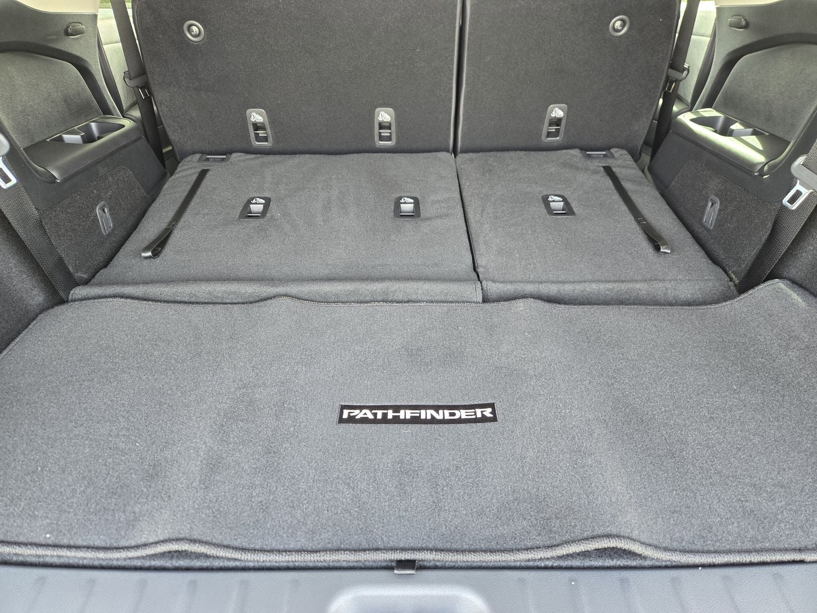 This 2026 Nissan Pathfinder SV in Super Black comes with the following features: 18 Painted Alloy Wheels, 3rd row seats: bench, 4-Piece Black Splash Guards, 4-Wheel Disc Brakes, 6 Speakers, ABS brakes, Air Conditioning, Alloy wheels, AM/FM radio: SiriusXM w/360L, Auto High-beam Headlights, Automatic temperature control, Bench Seat Carpeted Floor Mats, Brake assist, Bumpers: body-color, Cloth Seating Surfaces, Cross Bars, Delay-off headlights, Driver door bin, Driver vanity mirror, Dual front impact airbags, Dual front side impact airbags, Electronic Stability Control, Emergency communication system: NissanConnect Services, Four wheel independent suspension, Front anti-roll bar, Front Bucket Seats, Front Center Armrest, Front dual zone A/C, Front reading lights, Fully automatic headlights, Garage door transmitter: myQ Connected Garage, Heated door mirrors, Heated Front Bucket Seats, Heated front seats, Illuminated entry, Knee airbag, Low tire pressure warning, NissanConnect featuring Apple CarPlay and Android Auto, Occupant sensing airbag, Outside temperature display, Overhead airbag, Overhead console, Panic alarm, Passenger door bin, Passenger vanity mirror, Power door mirrors, Power driver seat, Power Liftgate, Power steering, Power windows, Radio data system, Radio: AM/FM Audio System with NissanConnect, Rear air conditioning, Rear anti-roll bar, Rear reading lights, Rear seat center armrest, Rear side impact airbag, Rear window defroster, Rear window wiper, Reclining 3rd row seat, Remote keyless entry, Security system, Speed control, Speed-sensing steering, Split folding rear seat, Spoiler, Steering wheel mounted audio controls, Tachometer, Telescoping steering wheel, Tilt steering wheel, Traction control, Trip computer, and Variably intermittent wipers. 21/27 City/Highway MPG