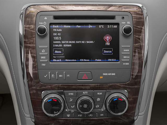 This 2013 Buick Enclave Premium Group in White Diamond Tricoat comes with the following features: 3.6L V6 SIDI DOHC VVT 6-Speed Automatic FWD Preferred Equipment Group 1SN (8-Way Power Driver Seat Adjuster, 8-Way Power Passenger Seat Adjuster, Bose Performance Enhanced System, Bose Sound System, Memory Settings, Rear Audio System Controls, and Side Blind Zone Alert w/Cross Traffic Alert), Premium Package (Articulating Headlights, Heated & Cooled Driver & Front Passenger Seats, Power Tilt & Telescopic Steering Column, and Power-Folding Heated Body-Color Outside Mirrors), FWD, 10 Speakers, 19 9-Spoke Chrome-Clad Aluminum Wheels, 20 Ultra Bright Machined Aluminum Wheels, 3.16 Axle Ratio, 3rd row seats: split-bench, 4-Wheel Disc Brakes, 7-Passenger Seating, ABS brakes, Air Conditioning, Alloy wheels, AM/FM radio: SiriusXM, Auto tilt-away steering wheel, Auto-dimming door mirrors, Auto-dimming Rear-View mirror, Automatic temperature control, Bose Advanced 10-Speaker Audio System, Brake assist, Bumpers: body-color, CD player, Compass, Delay-off headlights, Driver door bin, Driver vanity mirror, Dual front impact airbags, Dual front side impact airbags, Electronic Stability Control, Emergency communication system: OnStar Directions & Connections, Exterior Parking Camera Rear, Four wheel independent suspension, Front anti-roll bar, Front Bucket Seats, Front Center Armrest w/Storage, Front dual zone A/C, Front reading lights, Fully automatic headlights, Garage door transmitter, Heated door mirrors, Heated front seats, High intensity discharge headlights: Bi-Xenon, Illuminated entry, Leather steering wheel, Low tire pressure warning, Memory seat, NavTraffic, Occupant sensing airbag, Outside temperature display, Overhead airbag, Panic alarm, Passenger door bin, Passenger vanity mirror, Perforated Leather Seating Surfaces, Power door mirrors, Power driver seat, Power Liftgate, Power passenger seat, Power steering, Power Tilt-Sliding Sunroof, Power windows, Premium audio system: IntelliLink, Premium Ride Suspension, Radio data system, Radio: Color Touch AM/FM/HD/CD Player, Radio: Color Touch AM/FM/HD/CD w/Navigation, Rear air conditioning, Rear anti-roll bar, Rear audio controls, Rear reading lights, Rear window defroster, Rear window wiper, Remote keyless entry, Roof rack: rails only, Security system, SiriusXM Satellite Radio, Speed control, Speed-sensing steering, Spoiler, Steering wheel memory, Steering wheel mounted audio controls, Tachometer, Telescoping steering wheel, Tilt steering wheel, Traction control, Trip computer, Turn signal indicator mirrors, Variably intermittent wipers, Ventilated front seats, and Voltmeter.