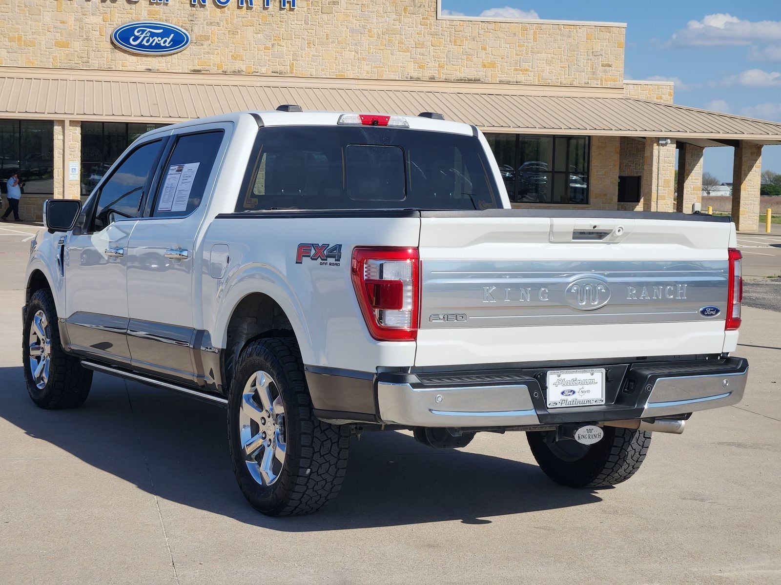 This 2022 Ford F-150 King Ranch in Star White Metallic Tri-Coat comes with the following features: 5.0L V8 10-Speed Automatic 4WD Bed Utility Package (BoxLink, LED Box Lighting, Power Tailgate, and Tailgate Step w/Tailgate Work Surface), Equipment Group 601A High (20 Machined-Aluminum Wheels, Multi-Contour Driver & Passenger Seats, Power-Deployable Running Boards, and Radio: B&O Unleashed Sound System by Bang & Olufsen), FX4 Off-Road Package (4x4 FX4 Off-Road Bodyside Decal, Hill Descent Control, Monotube Rear Shocks, Off-Road Tuned Front Shock Absorbers, Rock Crawl Mode, and Tray Style Floor Liner), King Ranch Chrome Appearance Package (Bright Belt Moldings, Chrome Door Handles w/Body-Color Strap, Chrome Skull Caps on Exterior Mirrors, and Wheels: 20 Chrome-Like PVD), Trailer Tow Package (Class IV Trailer Hitch Receiver, Integrated Trailer Brake Controller, and Pro Trailer Backup Assist), F-150 King Ranch, Ford Blue Advantage: Blue Certified Certified, 4D SuperCrew, 5.0L V8, 10-Speed Automatic, 4WD, Star White Metallic Tri-Coat, Java Leather, 18 Speakers, 18 Machined-Aluminum Wheels, 360 Degree Camera, 4-Wheel Disc Brakes, ABS brakes, Adjustable pedals, Air Conditioning, Alloy wheels, AM/FM radio: SiriusXM with 360L, Auto High-beam Headlights, Auto Start-Stop Removal, Auto tilt-away steering wheel, Auto-dimming door mirrors, Auto-dimming Rear-View mirror, Automatic temperature control, Brake assist, Compass, Delay-off headlights, Driver door bin, Driver vanity mirror, Dual front impact airbags, Dual front side impact airbags, Electronic Stability Control, Emergency communication system: SYNC 4 911 Assist, Extended Range 36 Gallon Fuel Tank, Exterior Parking Camera Rear, Front anti-roll bar, Front Bucket Seats, Front Center Armrest, Front dual zone A/C, Front fog lights, Front reading lights, Front wheel independent suspension, Fully automatic headlights, Garage door transmitter, Genuine wood console insert, Genuine wood dashboard insert, Genuine wood door panel insert, Heated door mirrors, Heated front seats, Heated rear seats, Heated steering wheel, Illuminated entry, King Ranch Leather Bucket Seats, LED Sideview Mirror Spotlights, Low tire pressure warning, Memory seat, Multicontour Seats w/Active Motion Removal, Occupant sensing airbag, Outside temperature display, Overhead airbag, Overhead console, Panic alarm, Passenger door bin, Passenger vanity mirror, Pedal memory, Power door mirrors, Power driver seat, Power passenger seat, Power steering, Power windows, Radio data system, Radio: B&O Sound System by Bang & Olufsen, Rain sensing wipers, Rear reading lights, Rear seat center armrest, Rear step bumper, Rear window defroster, Remote keyless entry, Security system, Speed control, Speed-sensing steering, Split folding rear seat, Steering wheel memory, Steering wheel mounted audio controls, SYNC 4 w/Enhanced Voice Recognition, Tachometer, Telescoping steering wheel, Tilt steering wheel, Traction control, Trip computer, Turn signal indicator mirrors, Twin Panel Moonroof, Variably intermittent wipers, Ventilated front seats, and Voltmeter. Certified. Odometer is 11364 miles below market average!