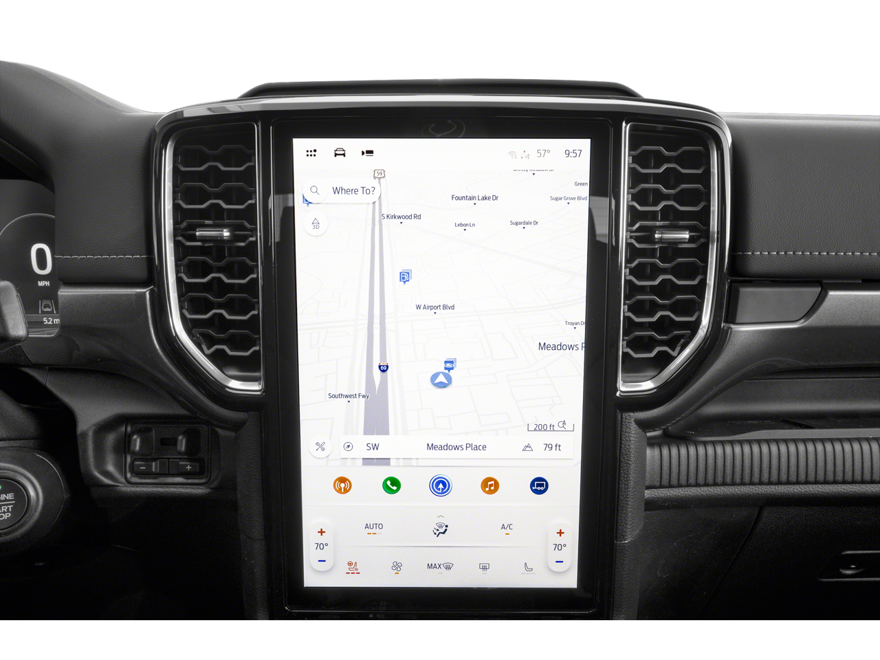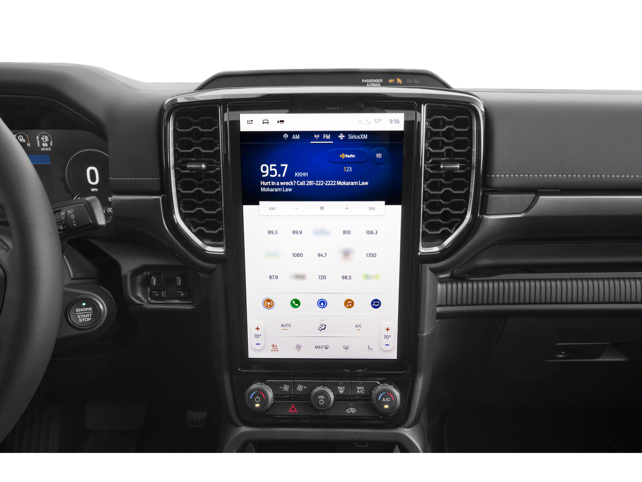 This 2024 Ford Ranger Lariat in Shadow Black comes with the following features: EcoBoost 2.3L I4 GTDi DOHC Turbocharged VCT 10-Speed Automatic 4WD Advanced Towing Package (Pro Trailer Backup Assist, Reverse Park Aid w/Trailer Guidance, and Trailer Brake Controller), Equipment Group 500A Standard, FX4 Off-Road Package (FX4 Off-Road Box Decal, FX4 Selectable Drive Modes, Off-Road Screen in Center Stack, and Off-Road Tuned Shocks), Sport Appearance Package (Gray Painted Center Bar & Grille Surround, Gray Painted Front Fascia & Rear Bumper, Gray Painted Wheel Lip Molding, and Sport Box Decal), Trailer Tow Package (Class IV Trailer Hitch Receiver), 4WD, 10 Speakers, 4-Wheel Disc Brakes, ABS brakes, Air Conditioning, Alloy wheels, AM/FM radio: SiriusXM, Auto High-beam Headlights, Auto-dimming Rear-View mirror, Automatic temperature control, Black Running Boards, Body-Color SecuriCode Keyless Entry Keypad, Brake assist, Compass, Delay-off headlights, Driver door bin, Driver vanity mirror, Dual front impact airbags, Dual front side impact airbags, Electronic Stability Control, Emergency communication system: SYNC 4 911 Assist, Exterior Parking Camera Rear, Front anti-roll bar, Front Bucket Seats, Front Center Armrest, Front dual zone A/C, Front fog lights, Front reading lights, Front wheel independent suspension, Fully automatic headlights, Garage door transmitter, Heated door mirrors, Heated front seats, Heated steering wheel, Illuminated entry, Leather Shift Knob, Leather steering wheel, Leather-Trimmed Front Heated Bucket Seats, Low tire pressure warning, Memory seat, Navigation system: Connected Navigation, Occupant sensing airbag, Outside temperature display, Overhead airbag, Overhead console, Panic alarm, Passenger door bin, Passenger vanity mirror, Power door mirrors, Power driver seat, Power passenger seat, Power steering, Power windows, Radio: B&O Sound System by Bang & Olufsen, Rain sensing wipers, Rear reading lights, Rear seat center armrest, Rear step bumper, Rear window defroster, Remote keyless entry, Security system, SiriusXM Satellite Radio, Speed control, Speed-sensing steering, Steering wheel mounted audio controls, SYNC 4A w/Connected Built-In Navigation, Telescoping steering wheel, Tilt steering wheel, Traction control, Trip computer, Turn signal indicator mirrors, Variably intermittent wipers, Voltmeter, and Wheels: 18 Machined Aluminum w/Dark Pockets.