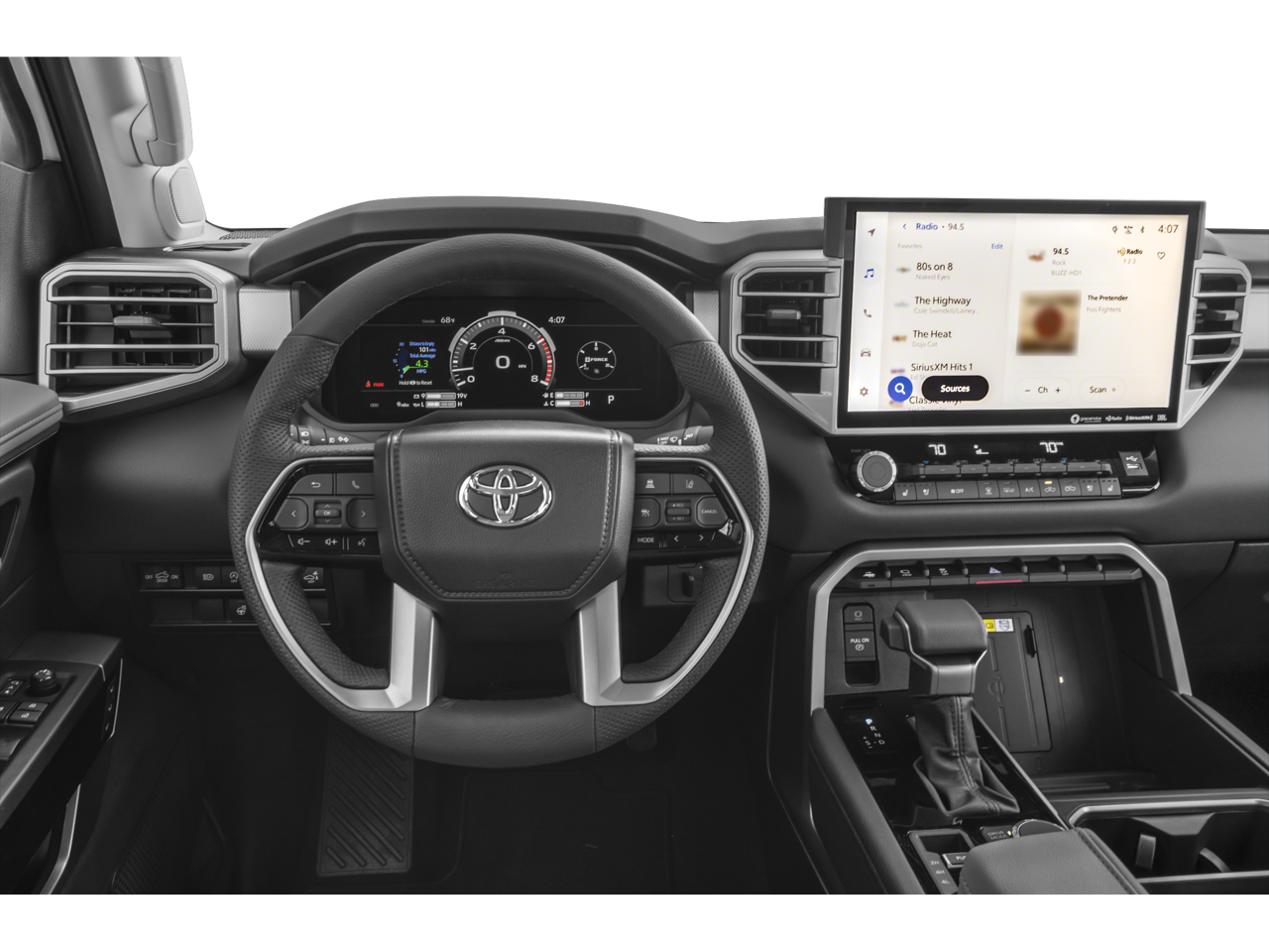 This 2024 Toyota Tundra 4WD comes nicely equipped with ABS brakes, Active Cruise Control, Alloy wheels, Electronic Stability Control, Front dual zone A/C, Heated door mirrors, Heated front seats, Illuminated entry, Low tire pressure warning, Navigation System, Remote keyless entry, Traction control, 20 Alloy Wheels, 3.31 Axle Ratio, 4-Wheel Disc Brakes, 8-Way Pwr Adjustable Heated/Ventilated Front Seats, 9 Speakers, Air Conditioning, AM/FM radio: SiriusXM, Apple CarPlay/Android Auto, Auto High-beam Headlights, Auto-dimming door mirrors, Auto-dimming Rear-View mirror, Automatic temperature control, Brake assist, Bumpers: body-color, Delay-off headlights, Driver door bin, Driver vanity mirror, Dual front impact airbags, Dual front side impact airbags, Emergency communication system: Safety Connect (10-year trial), Exterior Parking Camera Rear, Front anti-roll bar, Front Bucket Seats, Front Center Armrest, Front fog lights, Front reading lights, Front wheel independent suspension, Fully automatic headlights, Garage door transmitter: HomeLink, Knee airbag, Leather Shift Knob, Memory seat, Occupant sensing airbag, Outside temperature display, Overhead airbag, Overhead console, Panic alarm, Passenger door bin, Passenger vanity mirror, Power door mirrors, Power driver seat, Power passenger seat, Power steering, Power windows, Radio data system, Radio: Audio Multimedia System, Rear reading lights, Rear seat center armrest, Rear step bumper, Rear window defroster, Safety Connect, Security system, SofTex Seat Trim, Speed control, Speed-sensing steering, Split folding rear seat, Steering wheel mounted audio controls, Tachometer, Telescoping steering wheel, Tilt steering wheel, Trip computer, Turn signal indicator mirrors, Variably intermittent wipers, Ventilated front seats, and Voltmeter.